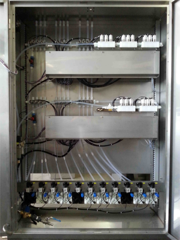 Chemikalienversorgung von 1 Taktwaschanlagen und 9 Waschschleudermaschinen in einem Schrank